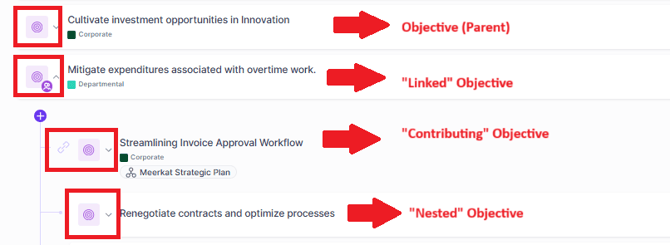 An Objective that can be added as a top level objective in another plan is an Existing (or Linked) Objective. They are shared across plans and contribute to the plan's success.