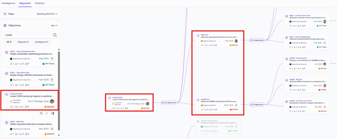 In the Alignment page, you'll see the contributing objectives displayed as child nodes to the parent objective.