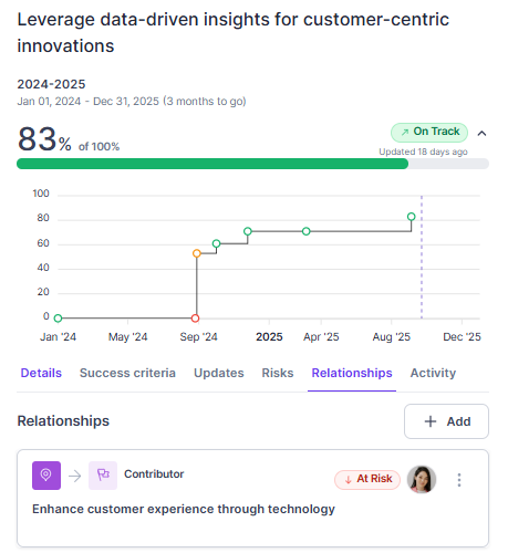 Once contributing objectives are added, their progress will impact the progress and health of the parent objective and they will be displayed in the Planner, the "Contributes to" section of the sidebar and in the "Relationships" tab.