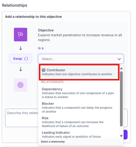 Relationships tab of the Objective's sidebar: click + Add relationship, and select Contributor relationship with the relevant objective.
