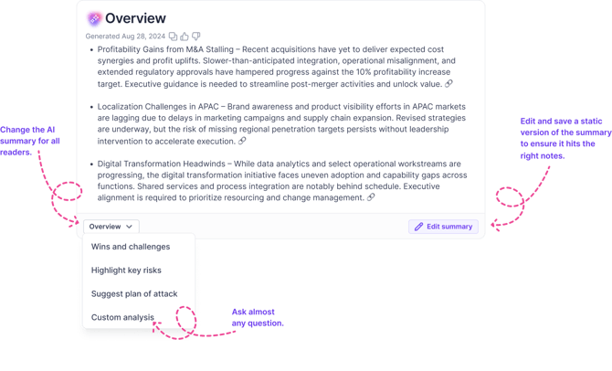 As your team and your ambitions grow, so does your strategy model. Since Reports are our window into the state of your organization’s strategy, we wanted a way to payback the time you’ve invested in making great reports. Enter Report Summaries, our answer to the untapped wealth of data accumulating in your reports, distilled to its most crucial insights.