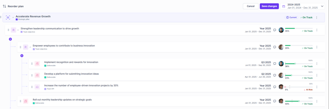 To reflect the strategic priority in a plan or to align with the order of company values, you can now reorder the plan's components like the focus areas, objectives, and other initiatives. With this reordering functionality, you can now reorder