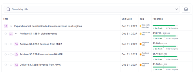 You can apply filters, grouping and edit the columns to show the desired information like dates, progress, targets, etc.